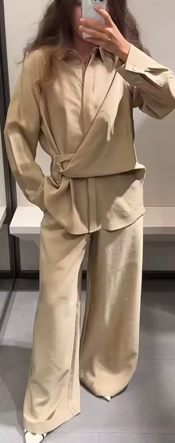Conjunto beige de dos piezas con estilo elegante y sofisticado. Incluye una camisa de manga larga con cinturón ajustable que realza la cintura y un pantalón palazzo de tiro alto que aporta comodidad y movimiento. Ideal para looks de oficina, eventos o para un outfit chic del día a día. Su tejido fluido y su diseño minimalista lo convierten en una prenda versátil y atemporal.