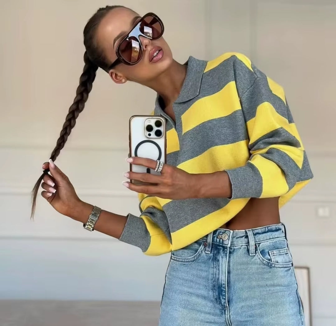 Este jersey tipo polo combina comodidad y estilo casual con un toque moderno. Su diseño de rayas anchas en color gris y amarillo aporta un aire juvenil y alegre, perfecto para cualquier ocasión. Con cuello tipo polo y escote en “V”, ofrece un ajuste relajado y un tejido suave al tacto que garantiza confort durante todo el día. Ideal para combinar con jeans, faldas o pantalones jogger para un look desenfadado y con personalidad.